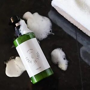 *お湯を含ませたタオルやスポンジなどに適量をとり、よく泡立ててから身体を洗いその後お湯で流してください。